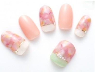搭配要点:粉色指甲+橙色指甲油薄+荷绿指甲油+白色指甲油,运用晕染的效果,更有春天的气息。