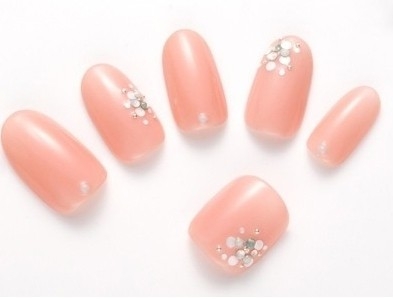 搭配要点:橘粉色指甲油+水钻,适合小清新的MM们。