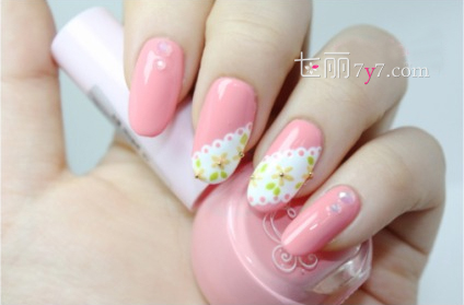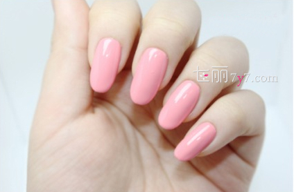 STEP 1:首先用粉红色的指甲油将指甲均匀涂抹,干了之后在指甲上覆盖一层护甲油,让指甲 看上去十分光亮。