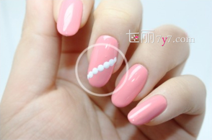 STEP 2:接着用白色指甲油的刷头,在指甲的斜角边点上大小均匀的圆点点。