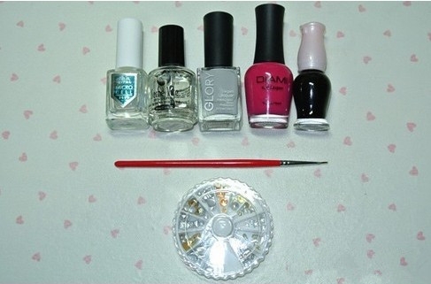 准备材料:亮油、玫粉色指甲油、灰蓝色指甲油、黑色指甲油、适量水钻