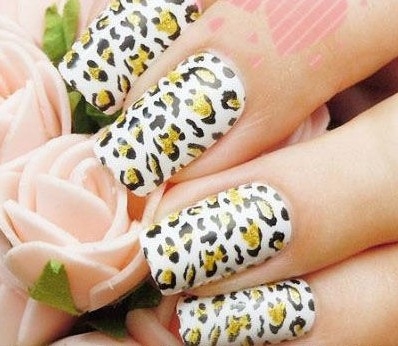 美甲要点:白色的指甲油为底色,加上黑色与金色打造的豹纹图案,更显优雅的Feel,不是千篇一律的美甲,让你更显独特的个性。