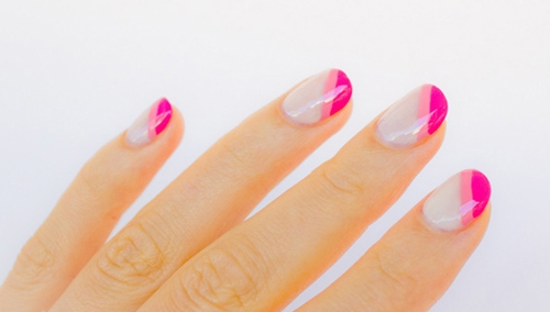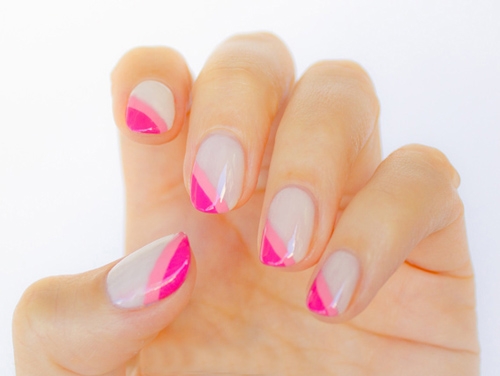 这款法式美甲斜纹效果,看上去更加摩登现代,而且很别致!同样产用乳白色指甲油打底,然后于指甲一侧涂上粉红色指甲油,最后玫红色指甲油,就可以了。