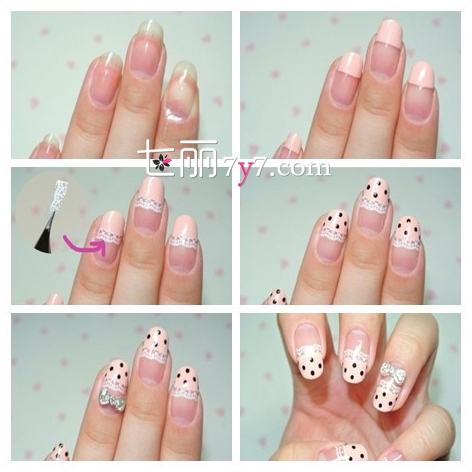 今天给大家带来一款超级可爱的蝴蝶结波点美甲,带有一些蕾丝的设计真的好甜美的呢,喜欢粉嫩感觉的女生不可以错过哦,美甲达人推荐DIY法式美甲教程,甜美波点俏皮又可爱。
