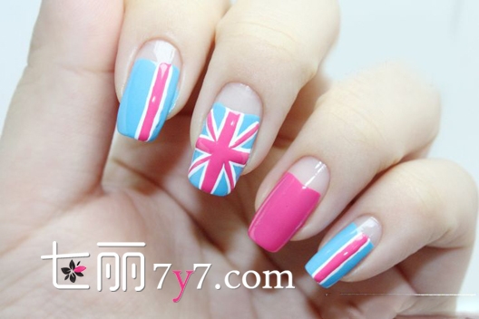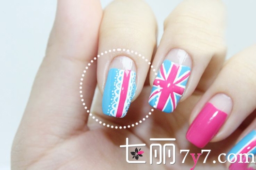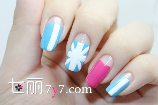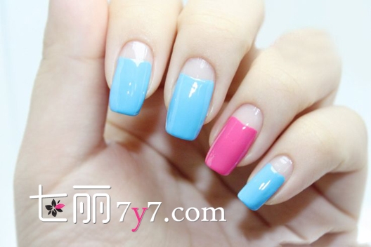 step1:首先修剪一下自己的指甲,修剪完打磨以后涂上底油,然后在涂蓝色、粉色甲油,指甲根部要留白一些出来,画出微笑线的状态就可以了。