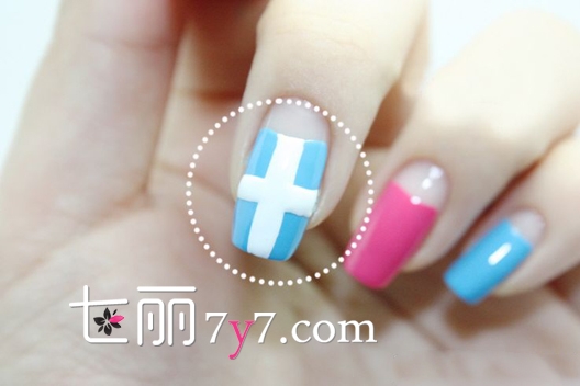 step2:用白色的指甲油,在中指指甲上画出一个十字,粗细和笔直状态靠自己拿捏。