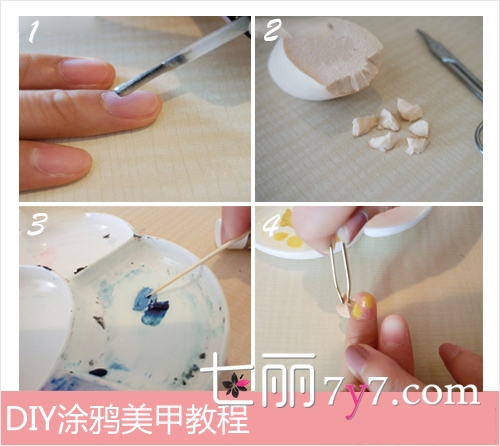 Step4:镊子加紧小块的海绵,先蘸取浅色系的黄色涂抹指甲。