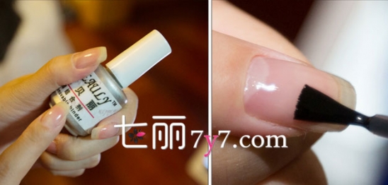 Step1:先打磨自己的指甲,可以打磨成自己喜欢的甲型,方的圆的都行,然后把甲面打毛。然后再涂一遍达地胶,这样能让光疗胶很好的与甲面结合,要涂的不薄也不厚。