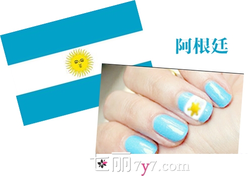 阿根廷国旗色彩活泼鲜艳,以颜色为主打,其他两种色彩可以做为辅助,增强看点,又不会显的太过花哨,因为国旗主要是蓝色,因此蓝色应为主色调。