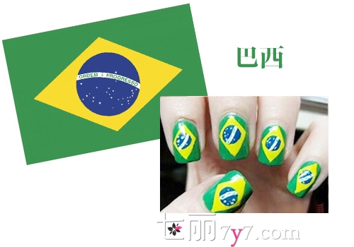 鲜艳的橄榄绿加上一点黄色,非常有巴西的热情感,此时根据个人的喜好进行创作,如果喜欢巴西的国旗,那么可以将国旗画在每个手指上,突显世界杯的气氛。