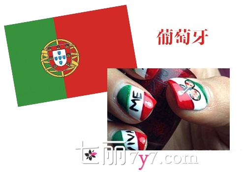 典型的欧洲国家的风格图彩,国旗以红、绿为主打色彩,点缀在指甲也是比较好演绎的,但要加些有葡萄牙风情的LOGO图案,会更有视觉性。