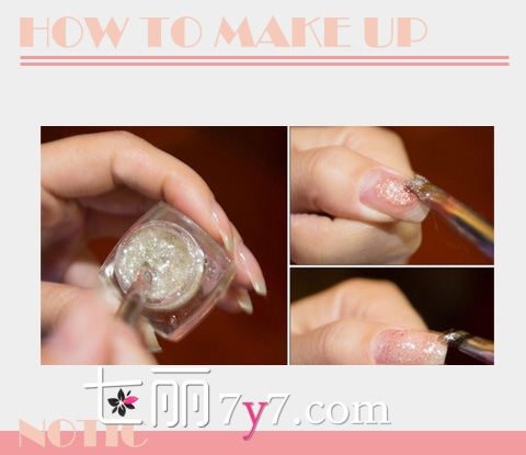 步骤一:首先均匀的刷上带有细微亮片的指甲油,薄薄的一层即可。不需要太厚,第一容易干,第二指甲油太厚不利于接下来的操作。
