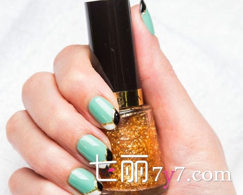这款法式的拼接美甲非常适合去海边度假,不同颜色拼接出的几何图案,金色的分割线又增加了质感,再用黑白色来进行填充非常华丽,小清新的薄荷绿非常受欢迎哦。
