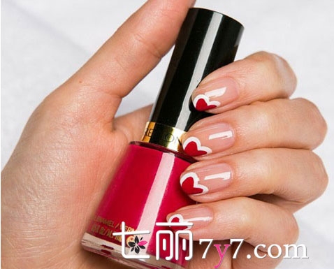 这款美甲造型只需要用到两个颜色,白色红心的图案给人一种非常甜蜜的感觉,先用红色指甲油在指尖的一侧画出一个小桃心,等其干透之后再用白色的点钻笔来进行钩编,小清新气质十足。