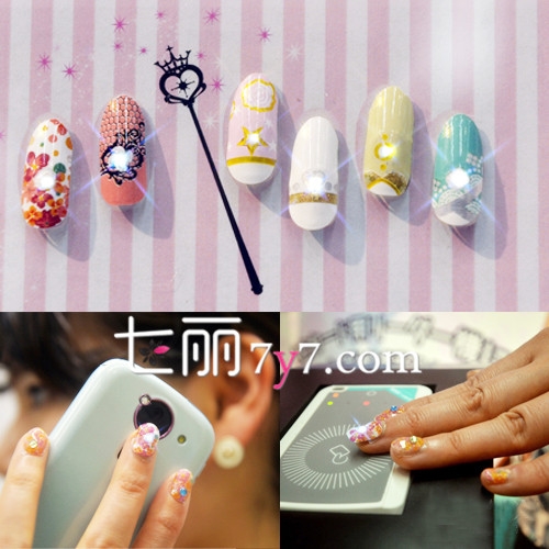 点评:当你将电话举起来的时候,这种植入磁条卡美甲就可以接受到感应,让你的指尖发出闪烁的光芒。植入的美甲方便拆卸,也不容易损害指甲片。亮光闪烁的造型非常适合盛夏。除了这种植入性质的美甲,彩绘美甲同样靓爆2014年!