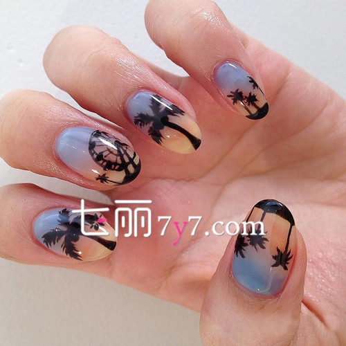 点评:夕阳款式的图案是时下最流行的美甲图案,夕阳下的椰子树和摩天轮让我们置身童话故事中,唯美中还带有一点小复古的格调。蓝色和淡黄色透露出夕阳西下的美感,让人心中一片宁静。