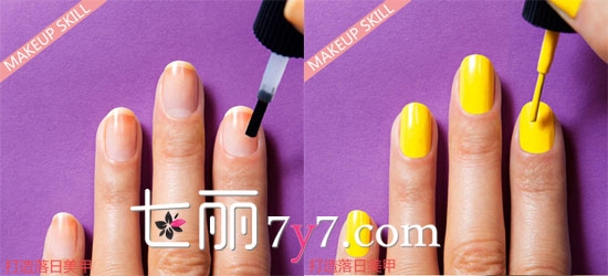 Step2:用明亮的柠檬黄指甲油涂抹于整个甲面。