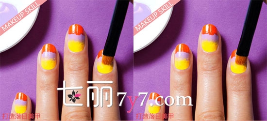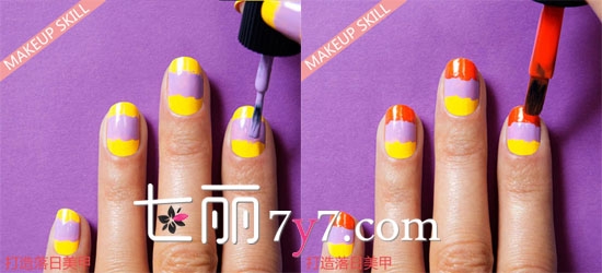 Step3:然后使用紫罗兰色甲油涂抹柠檬黄指甲油上面,这里注意哦,只涂抹中间部分。
