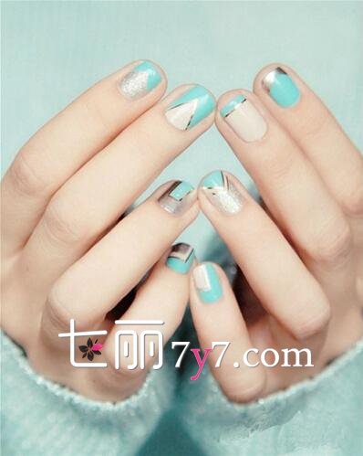 以清新的薄荷卡蓝作为底色,配上亮银为拼接色,透过不同的几何图案让指尖多了一层未来感的效果。在不同的色块拼接处有银色条状线条隔阂看,so cool。