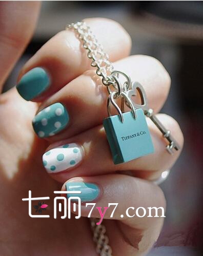 这是美甲达人最常见也是最经典的一款美甲,将俏皮的蓝和沉稳的白组合起来,利用波点的点缀将两个颜色完美融合在为一体。对于一些年轻的MM很适合,无论是在手上还是脚上都很好看。