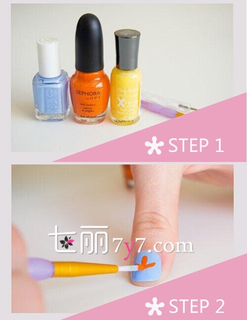 STEP1:准备好蓝色、橙色、大红色和黄色的指甲油,还有一只小号的指甲刷。