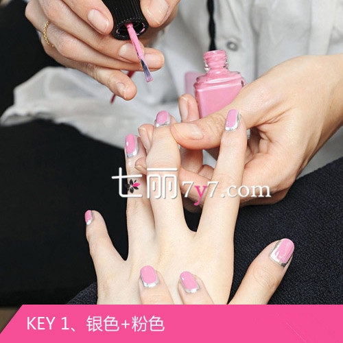 银色和粉色两者的搭配,撞出不一样的效果,用银色的指甲油涂抹在整个指甲上,然后在中间的位置涂上粉色的指甲油,留出银色的边框,这款美甲极具未来感,在家就能轻松DIY,甜美又不失时尚的气息,银色的酷MIX粉色的柔美。
