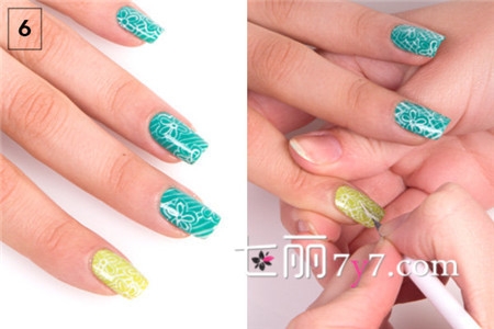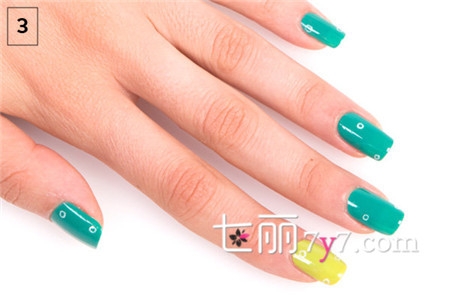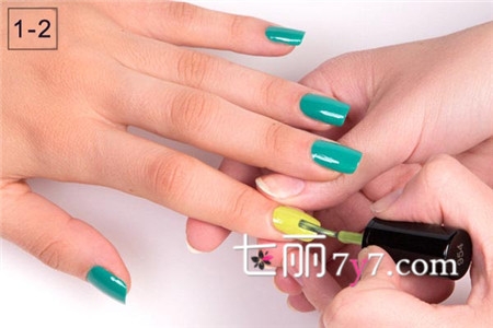 STEP 2:待底漆干燥后,食指涂上草绿色指甲油,其它指甲涂上蓝绿色指甲油。