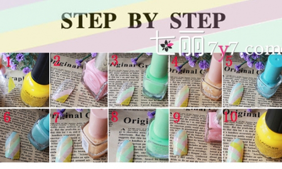 准备道具:黄色、粉色、浅绿色、浅橘色、天蓝色五种指甲油。