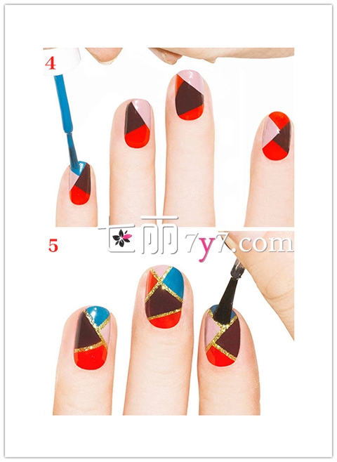 步骤5:用金色亮粉甲油涂抹在不同的颜色交汇的地方,呈细细的一条金边,最好是呈直线,如此才能分出漂亮的区域。最后抹到亮油即可。