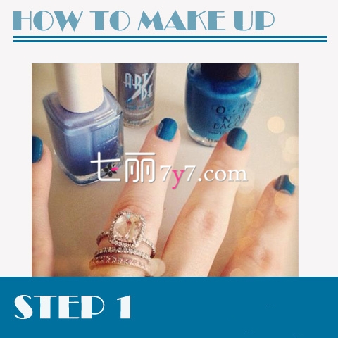 STEP1:准备好宝蓝色指甲油、淡蓝色指甲油、银色指甲油、透明胶、指甲笔,然后涂上一层宝蓝色的指甲油。