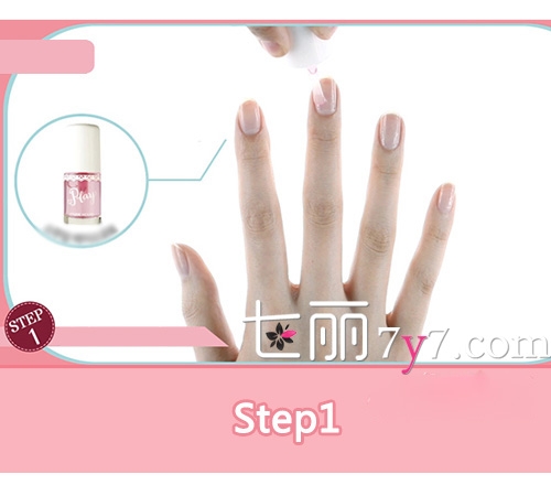 Step1:首先,我们要做好指甲的清洁和保护工作,清洗好指甲之后,均匀的涂上一层淡粉色的透明护甲油不仅可以让甲面看上去油亮有光泽,还可以避免甲油直接跟指甲盖接触造成的伤害哦。
