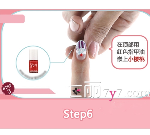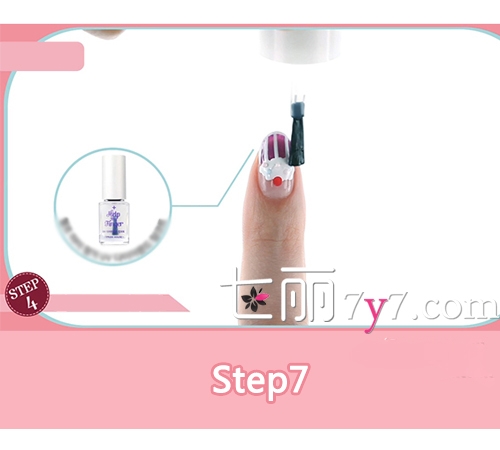 Step7:最后别忘了再涂上一层透明保护油,这样不仅可以保证指甲油的光泽度,还可以让美甲保持的更长久,避免因为刮碰或是触水让美甲面目全非。