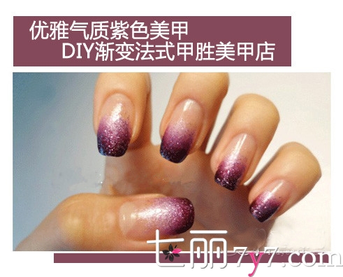 STEP 5:用小毛刷沾取适量的紫色闪粉,或者是带有散粉的指甲油。涂抹在渐变效果上,你会发现指甲油blingbling,太有爱了。