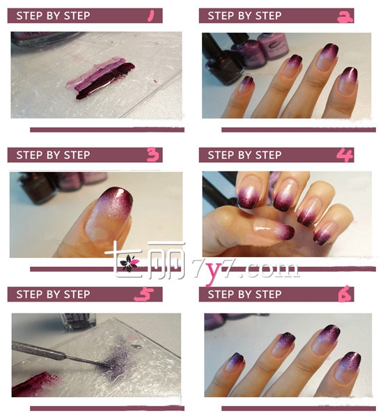 STEP 1:首先准备三种不懂程度深浅的紫色指甲油。将深到浅以此涂在平面上。
