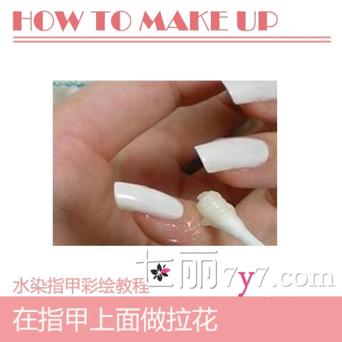 Step1:首先在指甲上涂上白色的指甲油,然后在指甲的周边涂上凡士林,便于待会很好的卸除多余的指甲油。