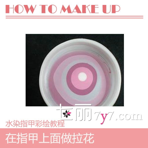 Step2:准备一杯冷水,在水面上依次滴入有渐变效果的指甲油,如图。