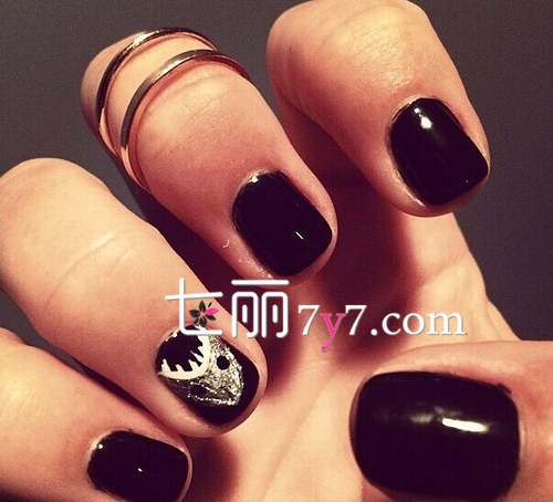 要想表现出酷帅感,那怎么能错过黑色系美甲,这款黑色的鲨鱼美甲,在无名指上印有鲨鱼的图案,银色抢眼闪耀的鲨鱼,生动且萌动,刚好符合酷晒卖萌主题,让你早秋速度成为一枚时尚潮人!