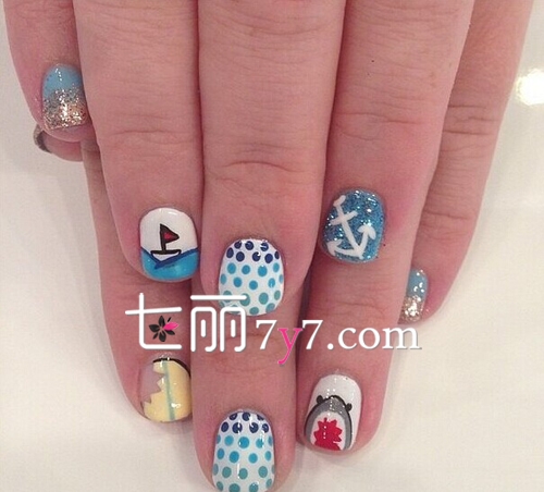 蓝色是海军风代表典型,这款美甲上有可爱的帆船,也有时尚的波点,更有酷酷的鲨鱼,很适合拒绝卖萌,走酷帅风格的妹子,即使是走在海边也可以大大的臭美一番,性感的图案和粉嫩的颜色,一定能帮你招来许多目光。