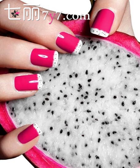 先在指甲上擦一层基础护甲油,保护你的指甲不受到伤害。待底油干透后,在指甲上均匀涂上白色指甲油;等白色指甲油彻底干透之后,再在上面涂上一层玫红色指甲油。这时候注意两层指甲油可能很难干透,可以用烘干机烘干;最后用指甲艺术笔蘸取黑色指甲油,点缀上代表火果籽的黑色小点,这样一款耀眼可口的火美甲就完成了