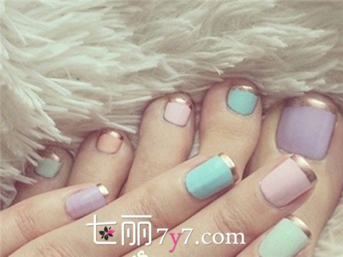 灵感来自于传统的白色法式,换上最令女孩们心动的可爱冰激淋色,金色的指甲边缘也是时尚感的体现。