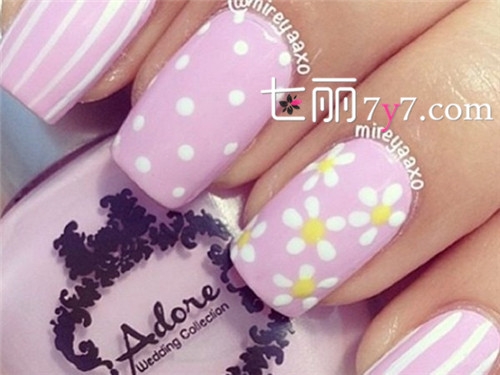 跳跃的白色条纹与波点在粉白色的底色上愈显和谐,无名指上点缀的花朵凸显小女生即视感。