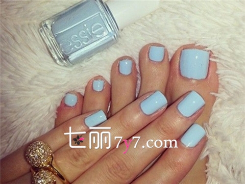 用接近肤色的裸色作为打底,以冰蓝色覆盖长出的指甲,非常适合皮肤白皙的妹子涂抹。