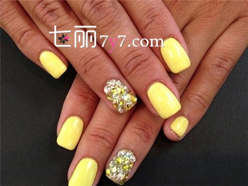 如果你担心撞色太过怪异,就选择同色系的碎钻装饰吧,不用很多,在你最喜欢的那两个指甲上贴得均匀饱满就足够完美了。