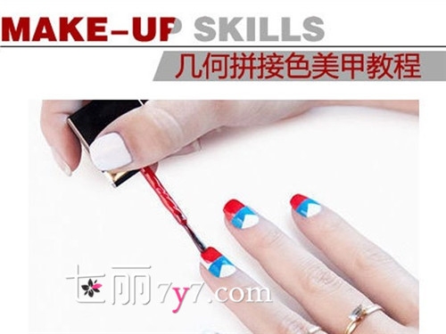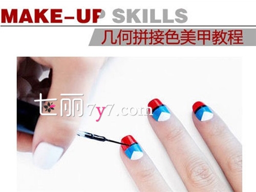 Step4:用红色甲油在指尖填色,红色和蓝色、白色的对比一下出来了。