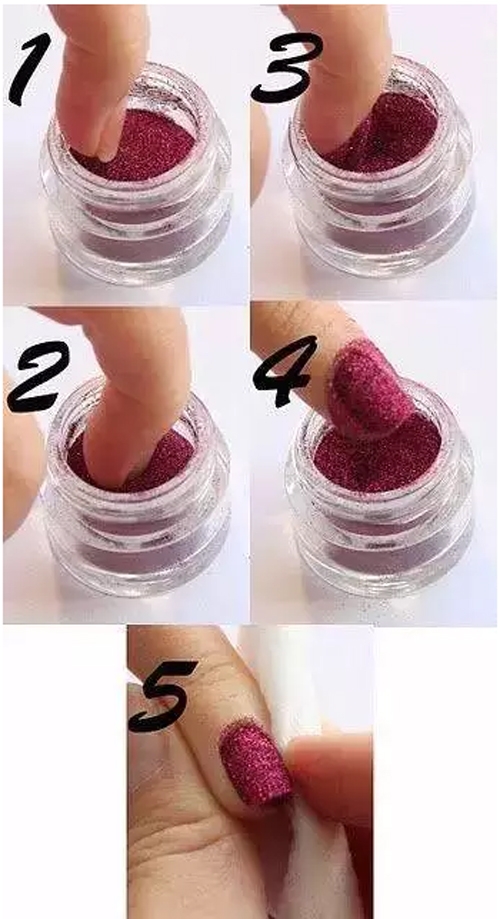 STEP2:趁甲油没有干之前,将手指在眼影粉里滚动一下。