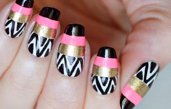 当深沉的黑色碰上明快的粉红、霸气的金色,当简单横条纹碰上清新的波西米亚,这些都在这款美甲上得到了十分漂亮的融合。给人感觉气场很强,但不会太出风头。