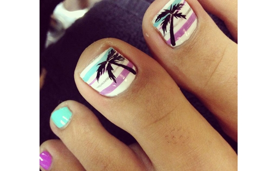 这款美甲图案,在大拇指的指甲上绘制了海岸风景。其他脚趾使用了图案相呼应的纯色。简单的构图,大气时尚,以白色、玫红、蓝绿色的横条图案做背景,绘制出一颗黑色剪影的椰子树,给人充满海滩的诱惑。