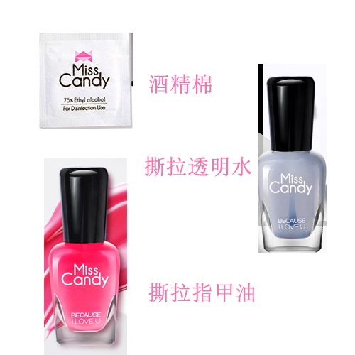 2、不小心涂在指甲以外的地方的话一定要尽快擦除,撕拉甲油是快干甲油,干了之后擦除的话会引起甲油翘边,持久度就没那么好了。