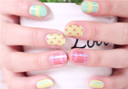 看上去活力十足的一款美甲,使用的甲油颜色很丰富,主色调是柠檬黄,还用到了西瓜红和薄荷绿等颜色,结合了四角星和条纹等图案,偏向无限活力的一款设计,画的时候可能就比较费时间了,所以要画这款指甲的话要做好长时间的等待哦!
