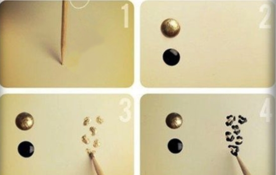 1.先选取需要画在里面的颜色,这里示范就用最常见的黑金搭配啦,用竹签沾金色甲油后不规则的点在指甲上。
